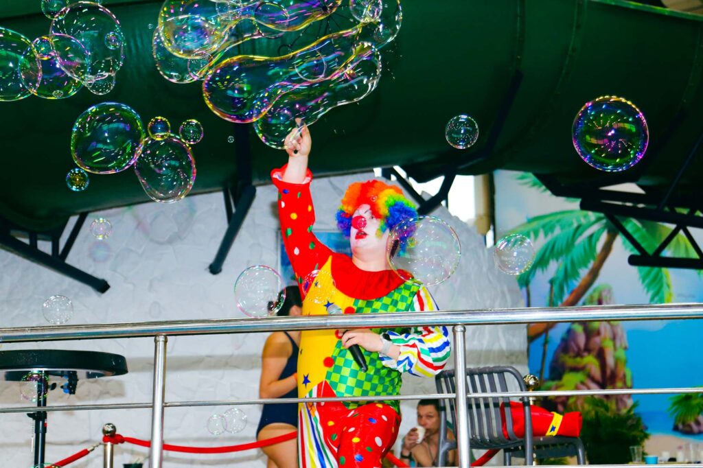 Мы подготовили уникальную программу, которая идеально дополнит ваш поход в аквапарк. Профессиональный ведущий, гигантские шлейфы из пузырей — это не просто выступление артиста, а полноценное погружение в сказку, которое идеально дополняет водные приключения.